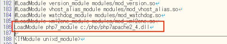 185行目あたりに「LoadModule」を記載する部分があります。