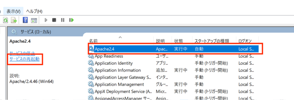 「Apache24」を選択し再起動します。
